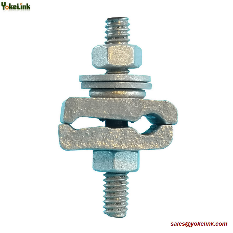 Cable Lashing Clamps used in CATV and telephone aerial construction to secure terminating lashing wire or ground wire to a separate strand. There are two types D type Cable lashing wire clamp and E type Cable lashing wire clamp. Yokelink D cable Lashing Clamp clamp has two separate clamping plate pieces, and is composed of a stud, two Washers, and two bug Nuts, Lashing clamps ensure bug nuts are tightened and the lashing wire itself is terminated properly. A mechanical galvanized finish provides extra corrosion resistance and safety against weather.